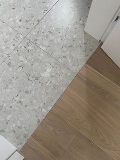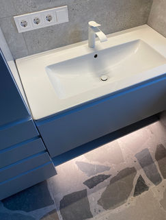 Lipant į antrą aukštą, turime medines laiptų pakopas bei betoninį, minimalistinį turėklą. Taipogi laiptai apšviesti į sieną įmontuotos išskirtinės LED juostos. Antrame aukšte turime du vonios kambarius - vaikų bei tėvų. Tėvų vonios kambaryje turime dideles terazzo plyteles kurios įsilieja į patalpą. Vaikų vonioje turime spalvingesnį plytelių raštą, kuris tęsiasi ir ant vonios spintelės, čia integravome vieną plytelę vietoje stalviršio. Vonios spintelė yra pagrindinis vaikų vonios akcentas - ryškios geltonos spalvos.